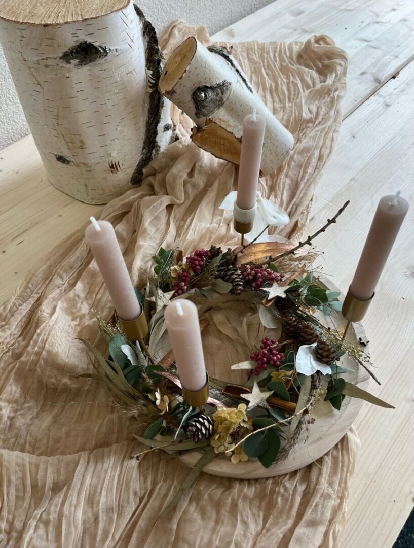 Verdures, conifères, aiguilles de sapin, cannelles, décoration de Noël et 4 bougies.