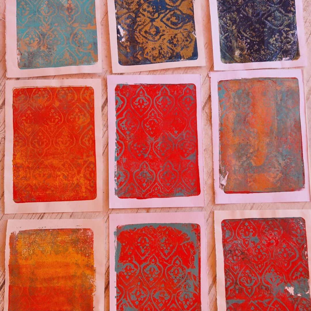 Atelier gelli plate : technique de reproduction à partir d’une plaque en gélatine, on superpose les couches de peinture acrylique en imprimant des textures. Permet d’être créative sans connaissances techniques. Prise en main rapide. Le végétal donne de très beaux rendus, mais aussi des magazines et des textures. Le papier qui est utilisé est du papier simple, mais il est possible de faire sur papier épais ou de couleur selon le résultat souhaité.