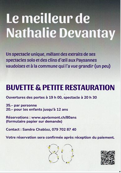 Le meilleur de Nathalie Devantay. Un spectacle unique, mêlant des extraits de ses spectacles solo et des clins d'œil aux Paysannes vaudoises et à la commune qui l'a vue grandir (un peu). Buvette et petite restauration sur place.
