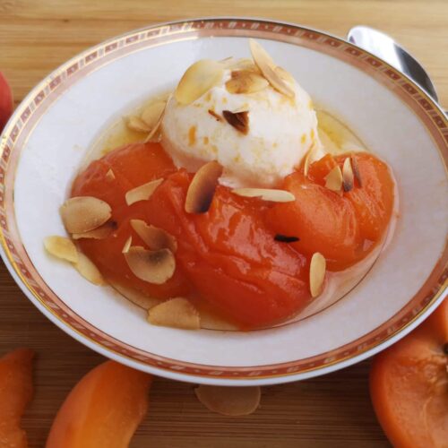 Garnir d’abricots avec leur sirop et parsemer d’amandes effilées grillées.