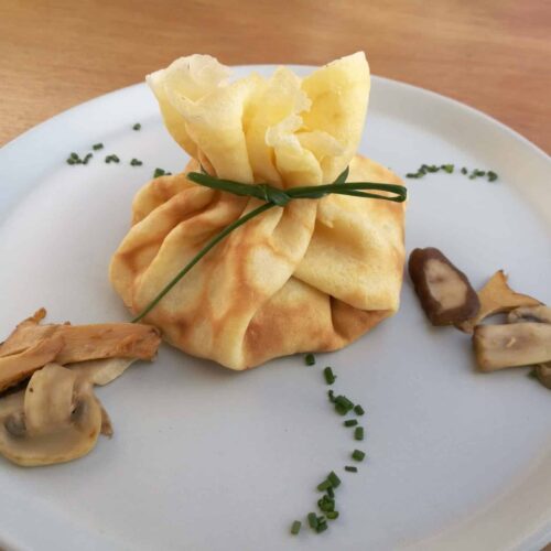Cuire de fines crêpes, les étaler et y déposer la farce répartie, attacher les aumônières avec les brins de la deuxième botte de ciboulette.
