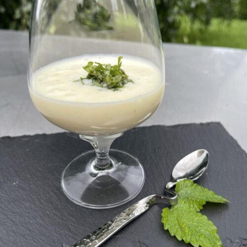 Servir dans des verres et décorer de quelques feuilles de mélisse.