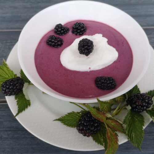Dresser la crème dans des coupelles, déposer une ou plusieurs quenelles et décorer avec des mûres.