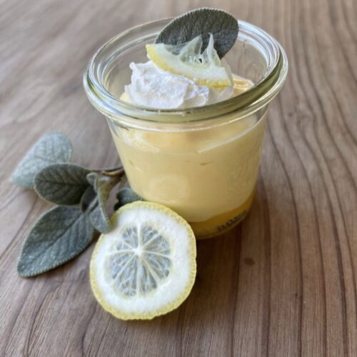 Retirer les feuilles de sauge et battre la crème en chantilly. Décorer le dessus des verrines, puis ajouter quelques feuilles de sauge et des lamelles de citron.