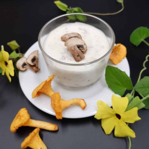 Fouetter la crème et remuer le qimiq jusqu’à consistance lisse. Ajouter aux champignons.