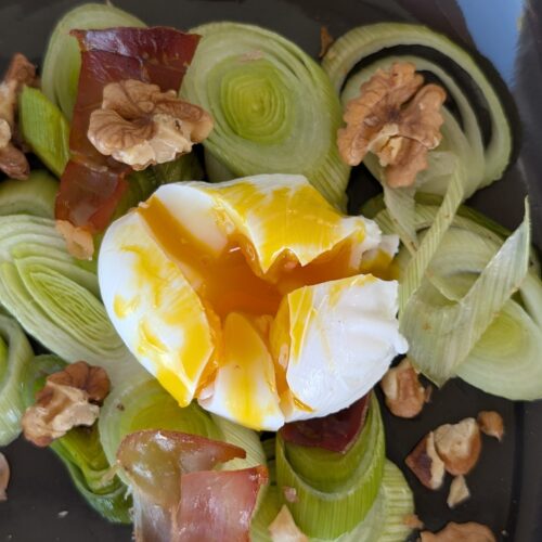 Préparer les assiettes avec les poireaux, les chips de jambon et quelques noix et un peu de mayonnaise.