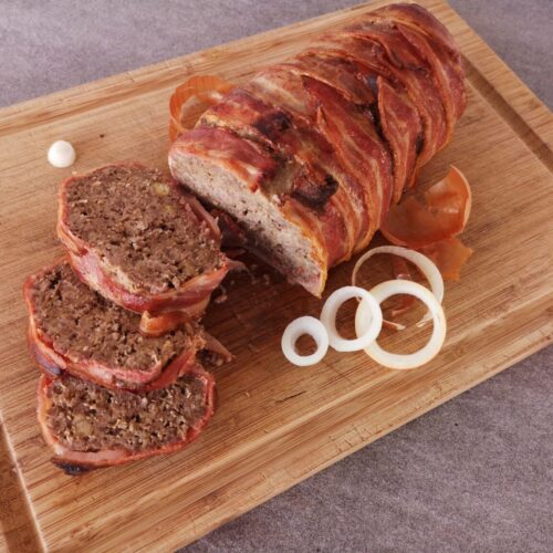 Disposer les tranches de lard sur une plaque chemisée de papier de cuisson en les faisant se chevaucher légèrement. Déposer le pain de viande dessus et rabattre les tranches de lard de part et d'autre. Retourner la préparation en mettant la soudure en dessous.