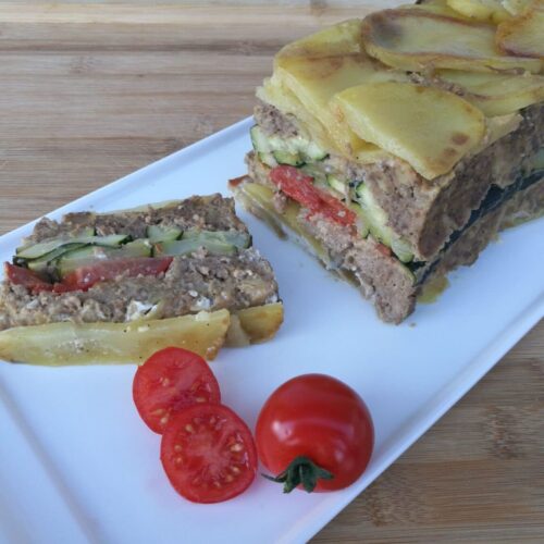 Pour le montage : beurrer un moule à cake. Disposer une rangée de pomme de terre dans le fond, puis alterner un peu de farce, une rangée de courgettes, un peu de farce, une rangée de pomme de terre, en disposant la tomate au milieu. Arroser de crème fraîche et parsemer de gruyère râpé.