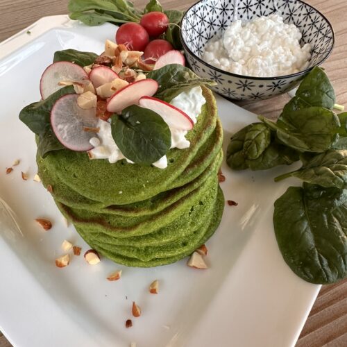 Dresser sur assiette avec le cottage cheese, quelques pousses d’épinards, des radis coupés en lamelles et des amandes concassées.