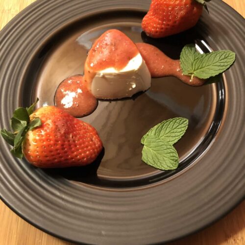 Démouler la panna cotta sur une assiette et recouvrir de coulis.