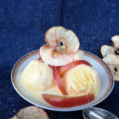 Chips de pomme : couper une pomme en fine tranche, poser les tranches sur une plaque et laisser 1h30 au four à 80 degrés, laisser durcir sur une grille
