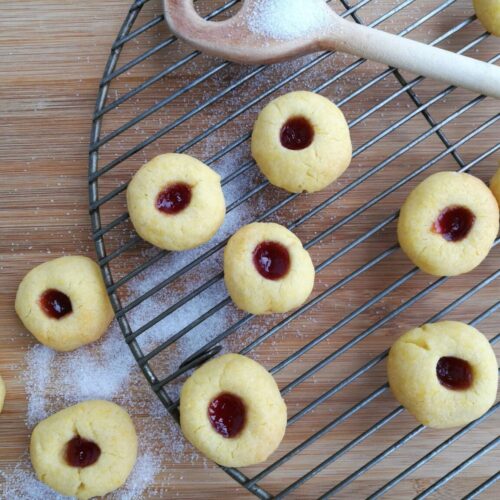 Former des petites boules de la grosseur d’une petite noix, avec l’extrémité du manche d’une spatule en bois, former une cavité, remplir le trou avec de la gelée de framboise. Remettre au frigo 15 minutes.