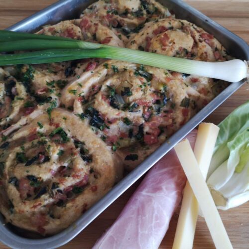 Abaisser la pâte en rectangle. Répartir la farce, rouler et couper en tranches de 5 cm.