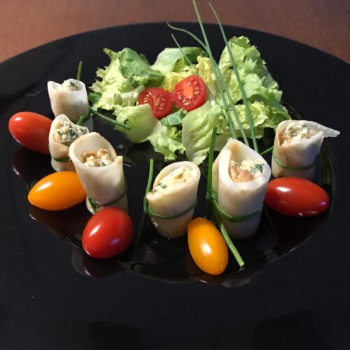 Disposer les tranches de céleri à plat. Déposer un peu de préparation puis les rouler et les attacher avec un brin de ciboulette. Couper les extrémités