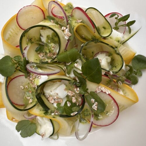 Dans une assiette, disposer les courgettes, la mozzarella, les radis, les oignons et le cresson fontaine. Parsemer de flocons chauds.